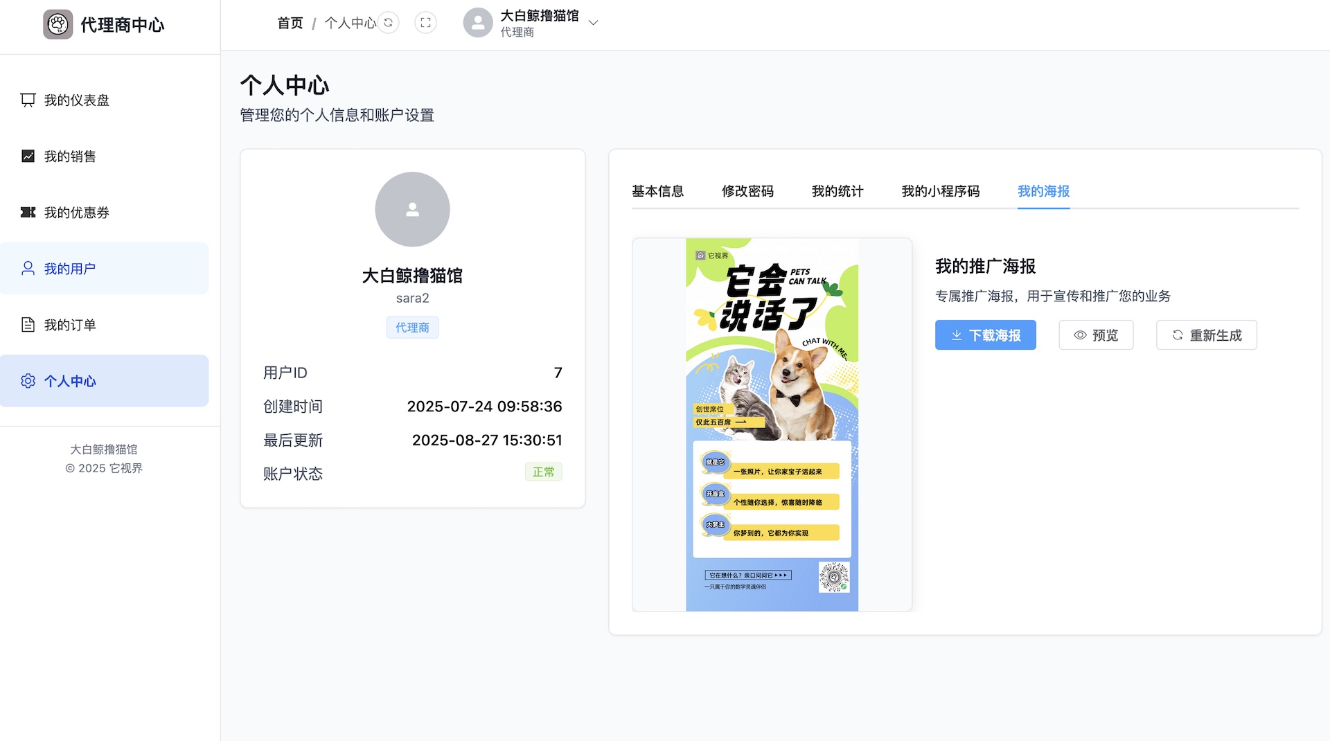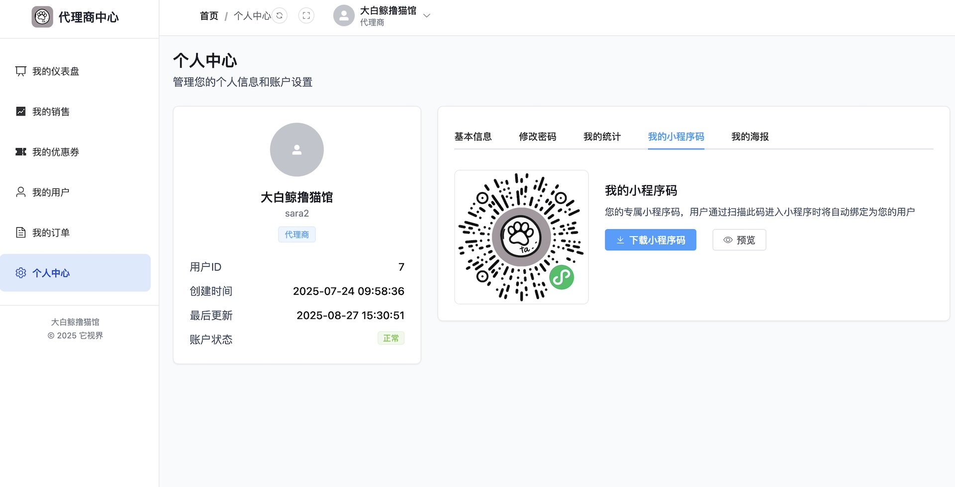 登录后点击左侧菜单【个人中心】,找到您的专属小程序二维码
